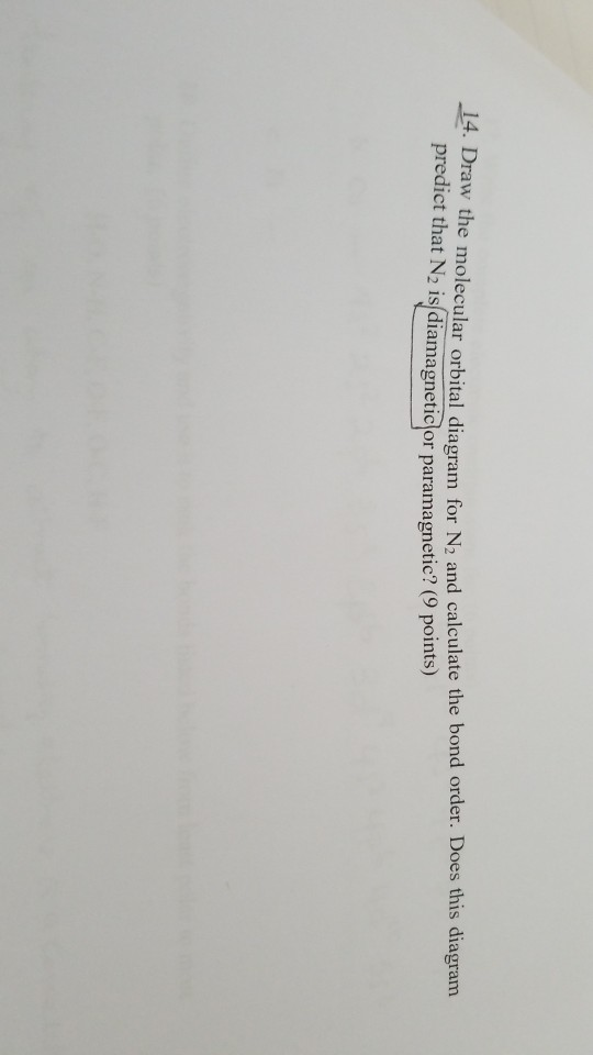 . How To Draw Molecular Orbital Diagram For N2 Indicate If It Is Diamagnetic Or Paramagnetic. Fill from the bottom up with 9 valence electrons total. σ 1 s 2 σ 1 s 2 σ 2 s 2 σ 2 s 2 π 2 p x 2 π 2 p y 2.